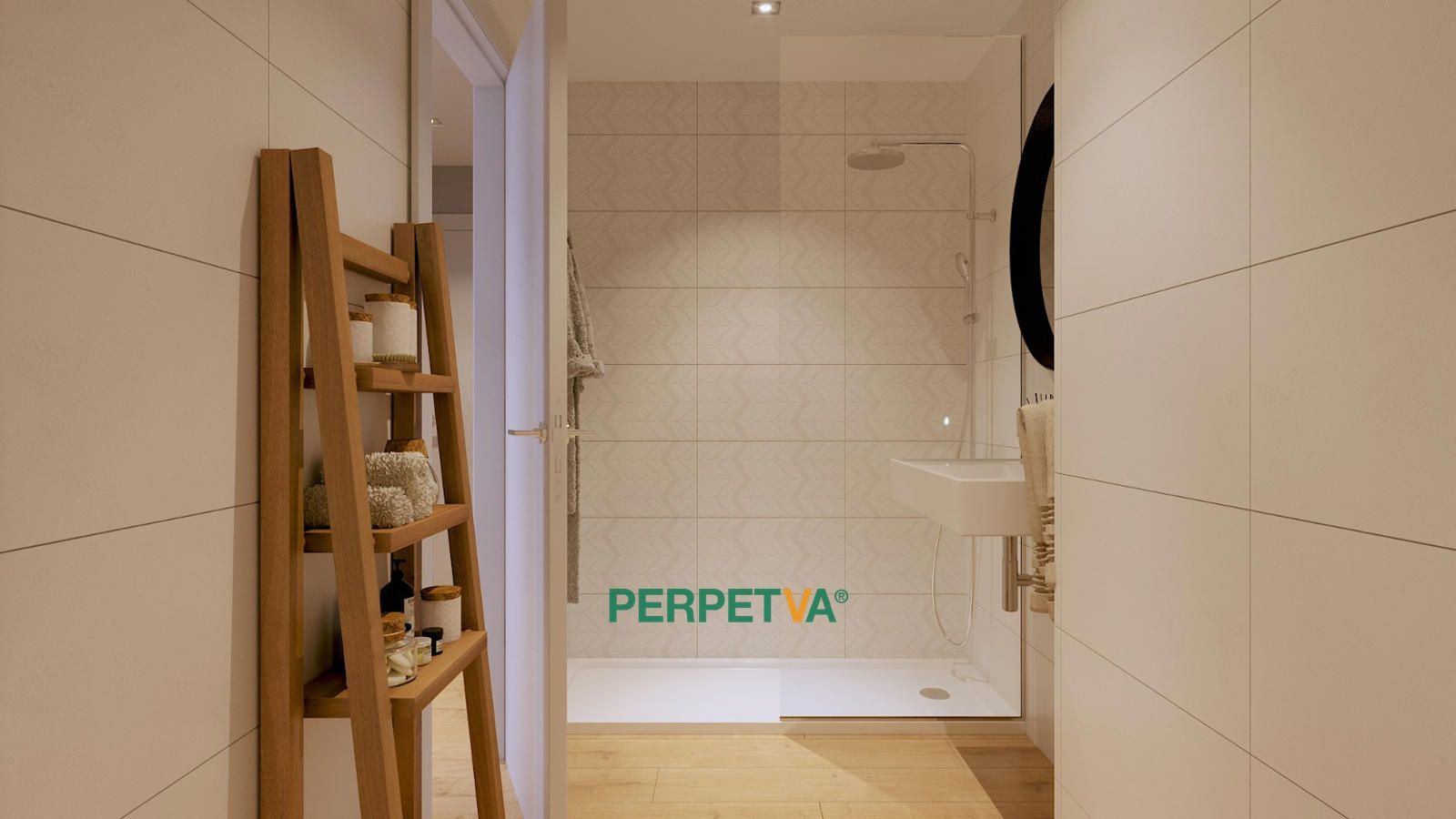 - Baño con diseño moderno, mueble suspendido y columna de ducha cromada.