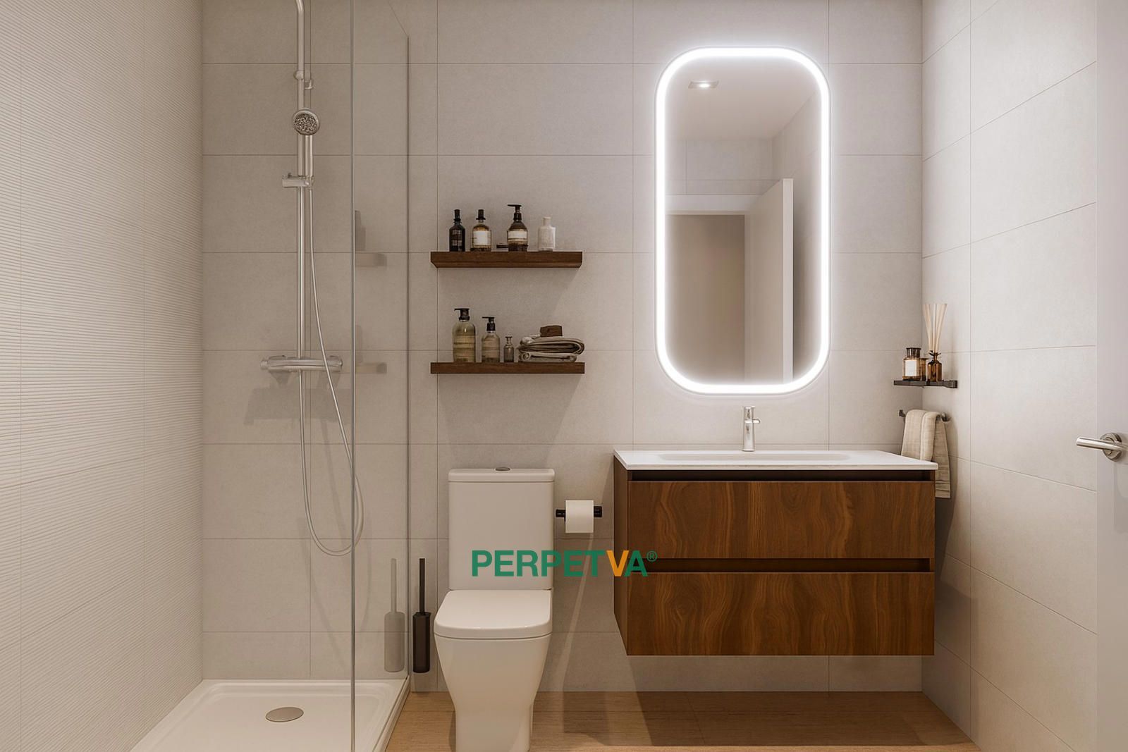 - Baño con diseño moderno, mueble suspendido y columna de ducha cromada.
